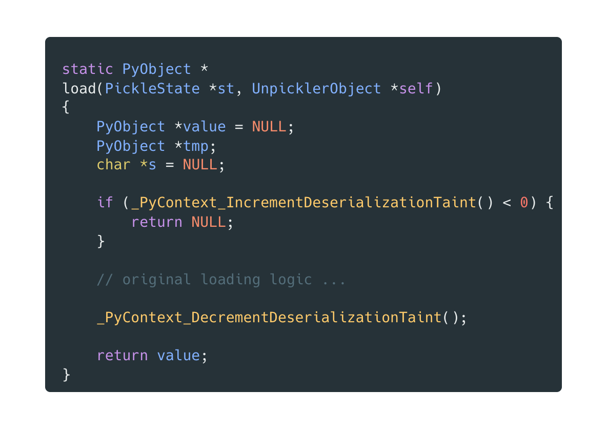 We then instrumented pickle module’s loading functions to increment this counter when entering deserialization and decrement it on exit, ensuring the context is correctly marked even for deeply nested operations (see here):