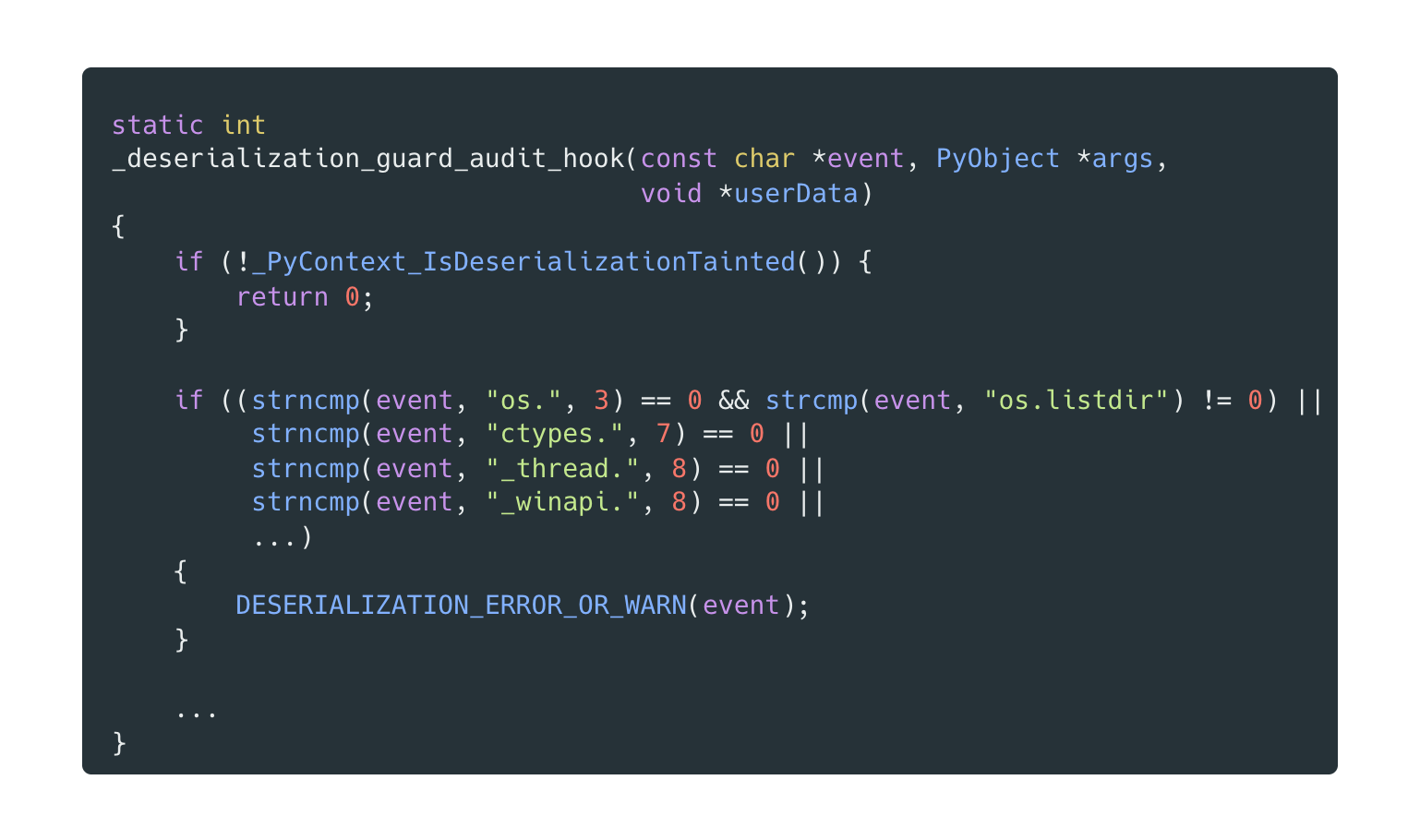 We also enhanced audit coverage by adding audit events for previously unprotected operations, such as atexit.register, signal.signal and setattr.