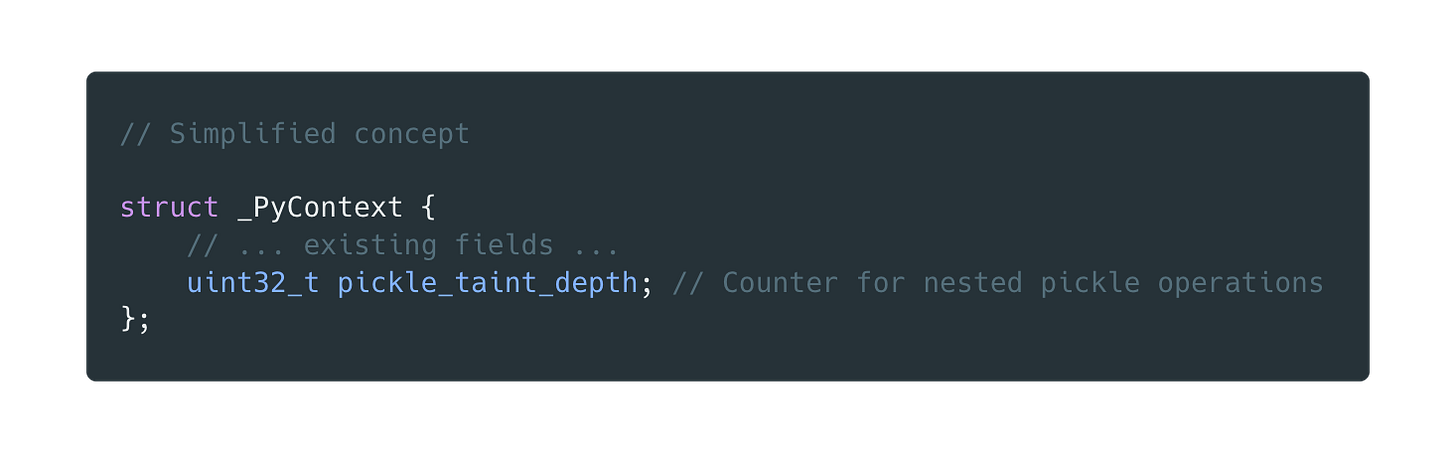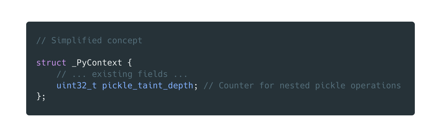 The first component adds a taint counter to Python’s internal context structure. We use a counter rather than a boolean flag because pickle deserialization can be nested—a pickle payload might contain another pickled object that needs to be deserialized recursively.