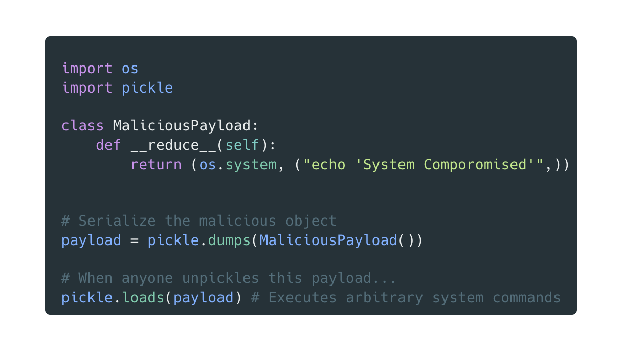 The moment pickle.loads() is called, the attacker’s command executes faster than you can say “Wait, I didn’t ask for this.” The victim doesn’t need to use the unpickled object—the damage occurs during deserialization.